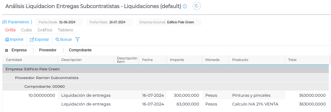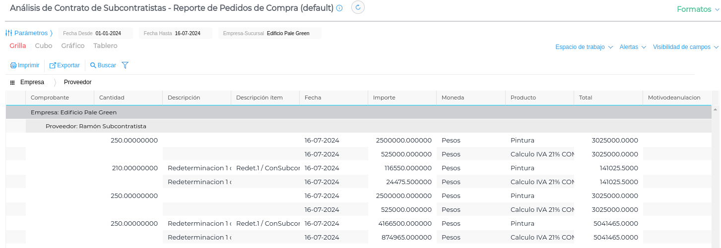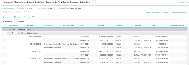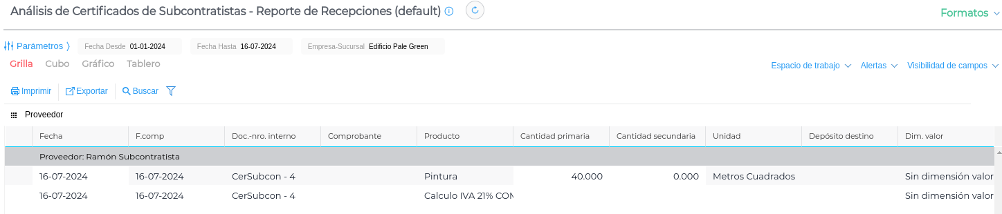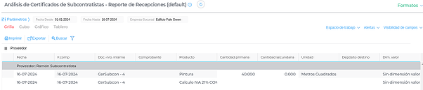 Se visualiza la cantidad certificada de cada trabajo subcontratado, con proveedor, producto, cantidad, etc.
