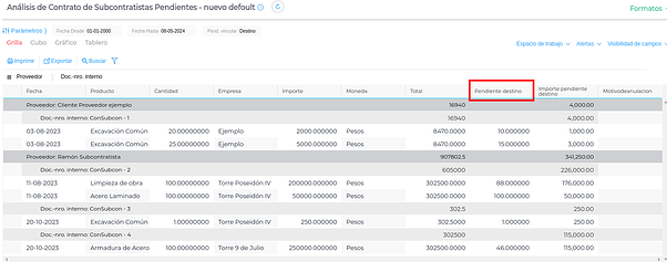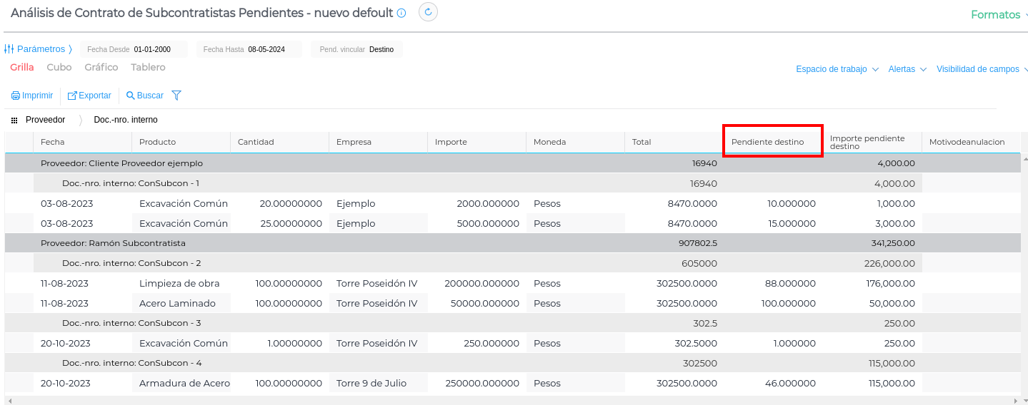 Se visualizan los contratos ingresados dentro de las fechas seleccionadas, con proveedor, ítem de obra y cantidad.