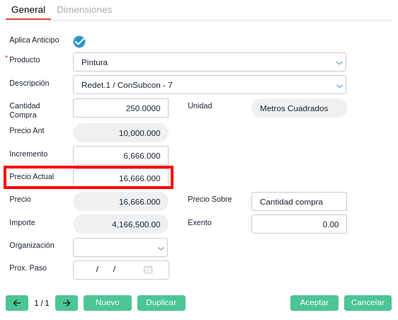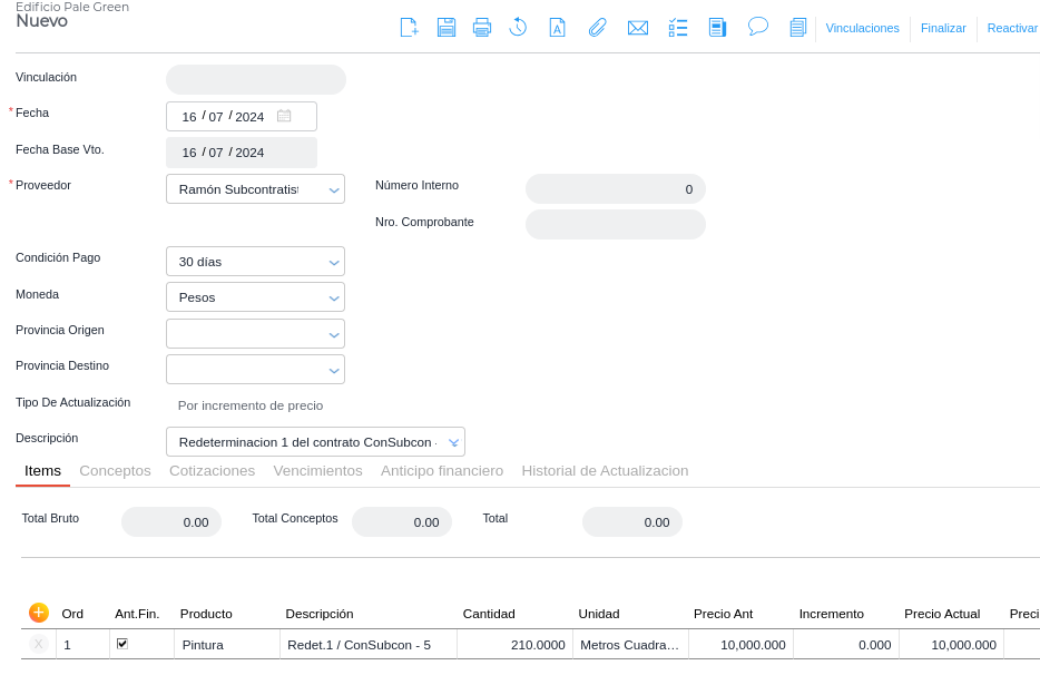 En esta modalidad se crea un nuevo contrato con los ítems pendientes de certificar y se completa el precio con el nuevo precio del ítem que será igual al precio original más el aumento, en el campo “Precio actual”