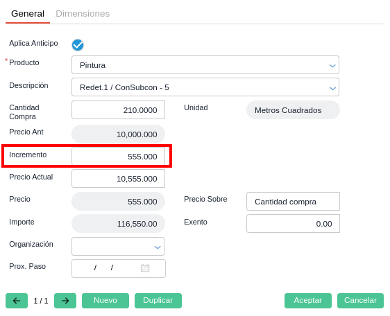 En esta modalidad se crea un nuevo contrato con los ítems pendientes de certificar y se completa el precio con el aumento de precio. Solo se ingresa el incremento de precio. Luego se certificará el contrato original al valor original y también el nuevo contrato que contiene por el valor del aumento.