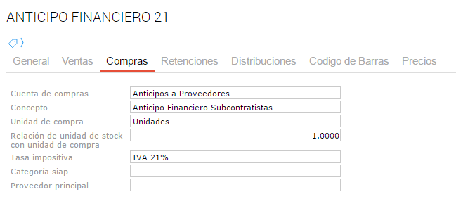 En la solapa compras se indica el IVA correspondiente. Se deben crear tantos productos de anticipo financiero como tasas de IVA distintas apliquen.
