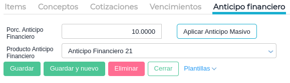 En la solapa anticipo financiero se indicará el porcentaje del mismo y el Producto anticipo financiero con el IVA correspondiente.