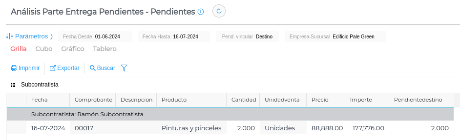Se visualizan todos los Partes de liquidación de entregas a subcontratistas pendientes de generar la Liquidación de Entrega.