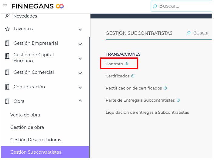 Para crear un nuevo contrato se ingresa en: Obra → Gestión de Subcontratistas → Transacciones → Contrato