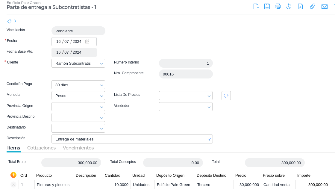 Parte de entrega de materiales a subcontratistas