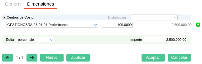 Dentro de cada ítem, en la solapa “Dimensiones” se indica a qué centro de costos de la obra pertenece.