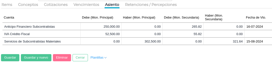 Nótese que el producto que utiliza la Factura de Anticipo es el seleccionado en el Contrato de Subcontratistas, y el monto reflejado es en base al porcentaje de Anticipo también seleccionado en el Contrato. Puede verse el asiento que se genera. El anticipo queda registrado en la cuenta anticipo financiero.