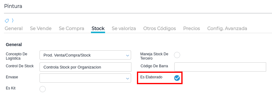 En la solapa Stock se indica que estos productos son elaborados.