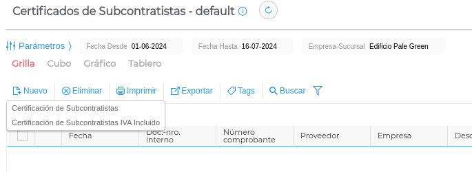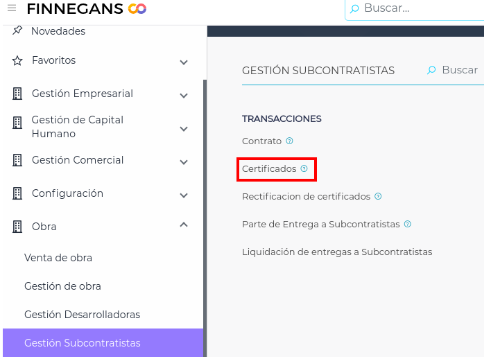 Para ello se utiliza un asistente que trae sólo aquellos ítems que están pendientes de certificar mencionados en el contrato de subcontratistas. Se realiza desde Obra → Gestión de Subcontratistas → Transacciones → Certificados