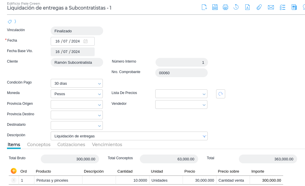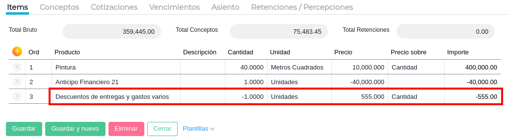 Puede incluirse algún ítem especial como una multa. En ese caso se lo carga con cantidad negativa. También se puede cargar un ítem con las entregas de materiales al subcontratista. En cantidad se utiliza un valor negativo y en precio el total de la liquidación.