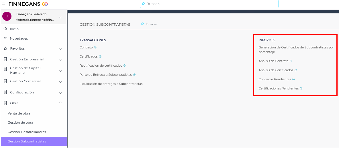 Se encuentran en el menú Gestión empresarial → Obra → Gestión de Subcontratistas → Informes