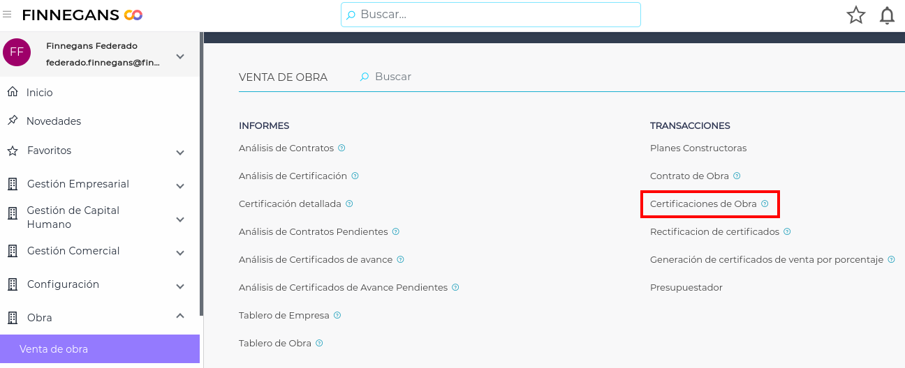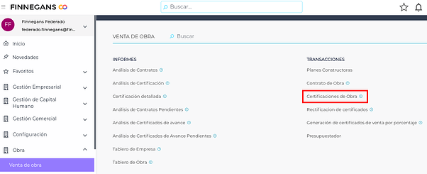 Se accede desde Menú → Obra → Venta de obra → Transacciones → Certificaciones de Obra
