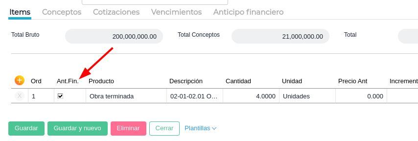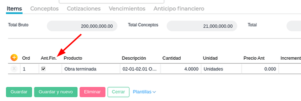 Nótese que cada ítem tiene una casilla que indica todos aquellos ítems que tienen imputado el anticipo financiero.