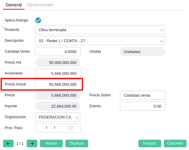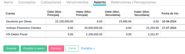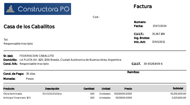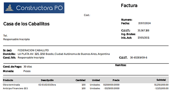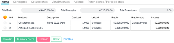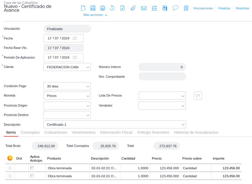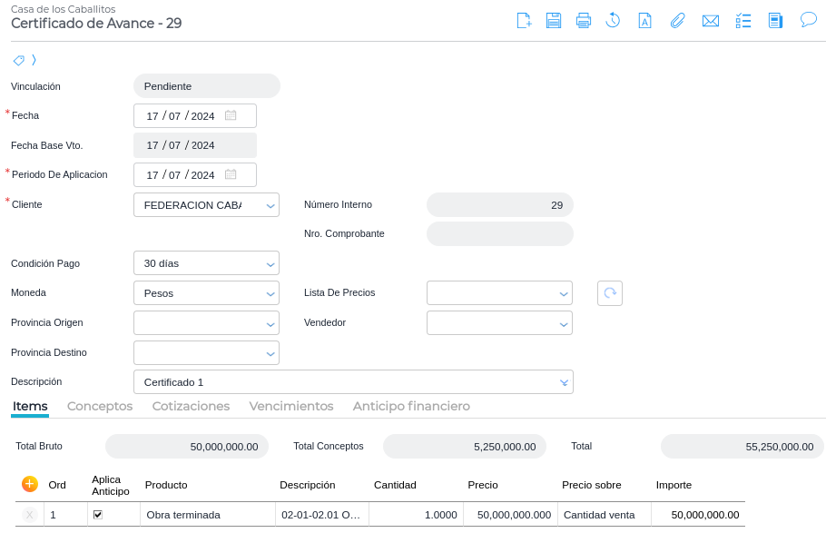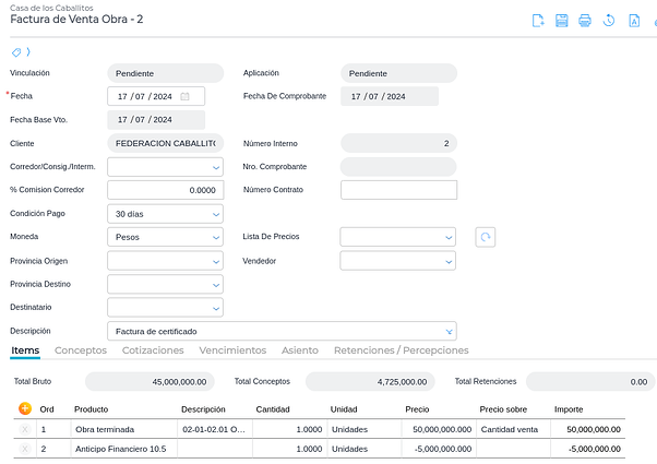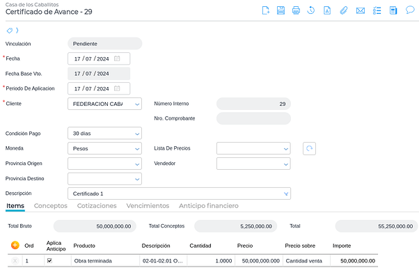 Importante: tener en cuenta que el descuento de anticipo se realizará en la factura del certificado correspondiente en forma proporcional, respetando el porcentaje por el cual se factura el mismo.