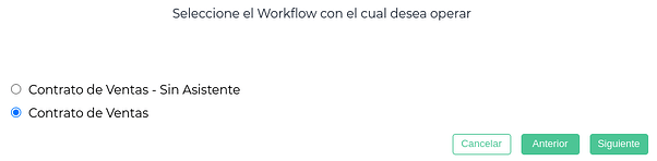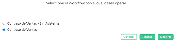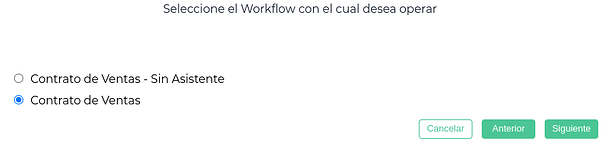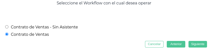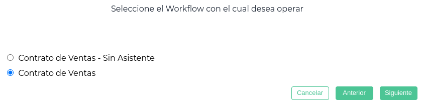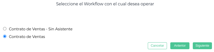 Clickeando entonces sobre el botón “Nuevo”, se abre el asistente, se selecciona la opción del workflow “Contrato de ventas” y se clickea en “Siguiente”.