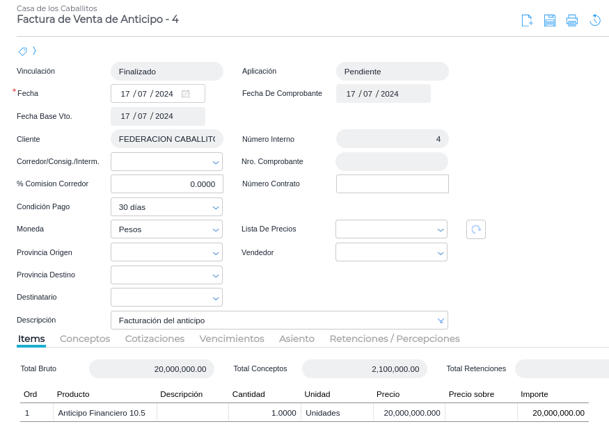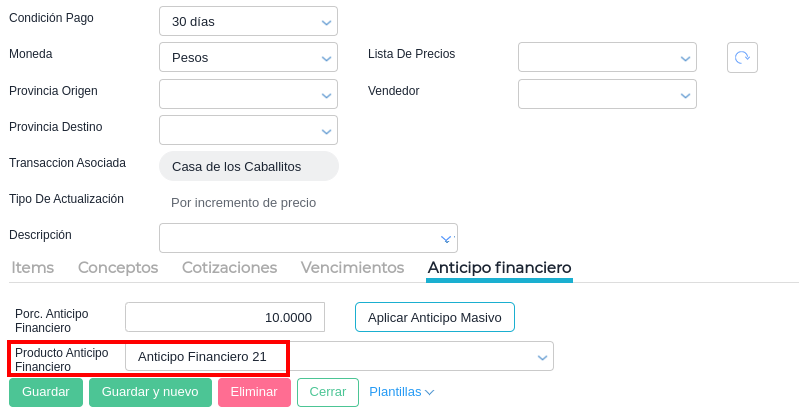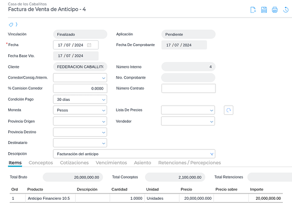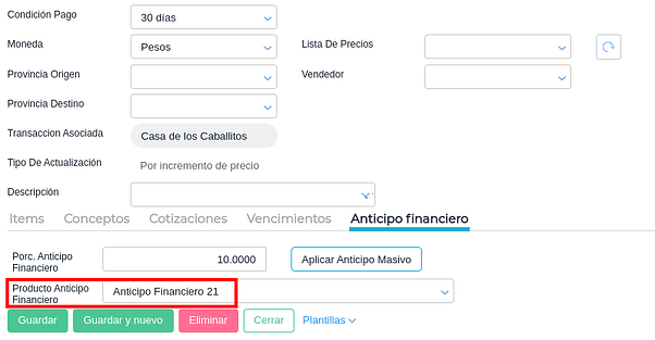 Nótese que el Anticipo Financiero se descuenta automáticamente en la Factura: