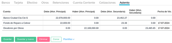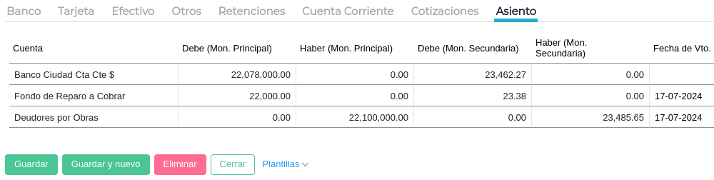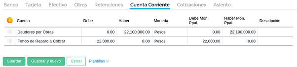 En la solapa “Cuenta corriente” agregar una línea y cargar la cuenta “Fondo de reparo a Cobrar”. En el debe se ingresa el importe que corresponde al fondo de reparo retenido por el cliente.