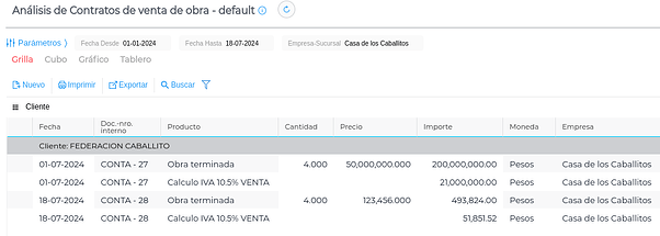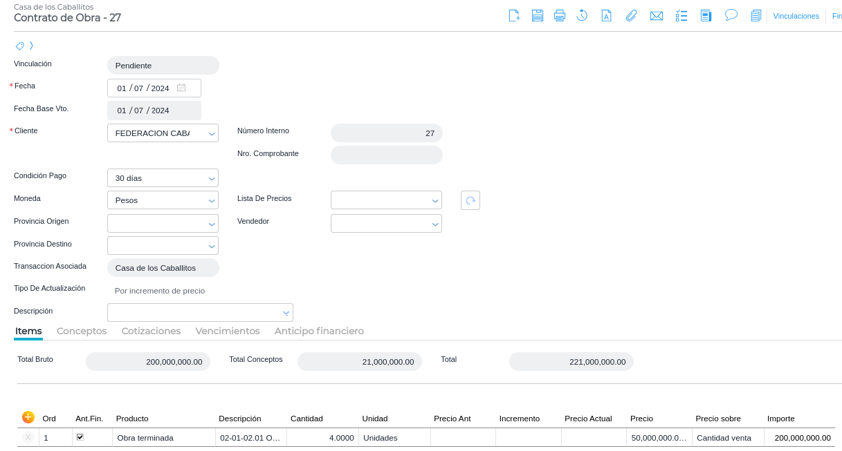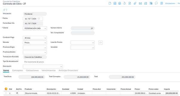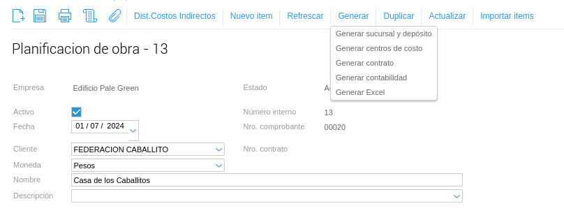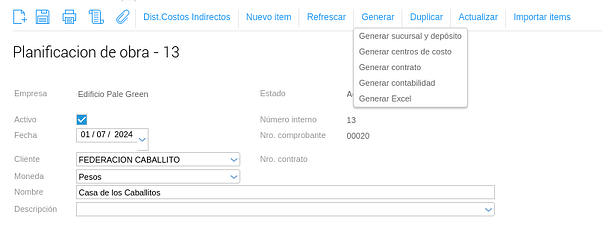 Generar contrato: Una vez aprobado el plan de obra puede generarse el contrato de obra. En el contrato de venta de obra, cada ítem de venta de obra queda asociado con el centro de costo, con una sucursal y un depósito.
