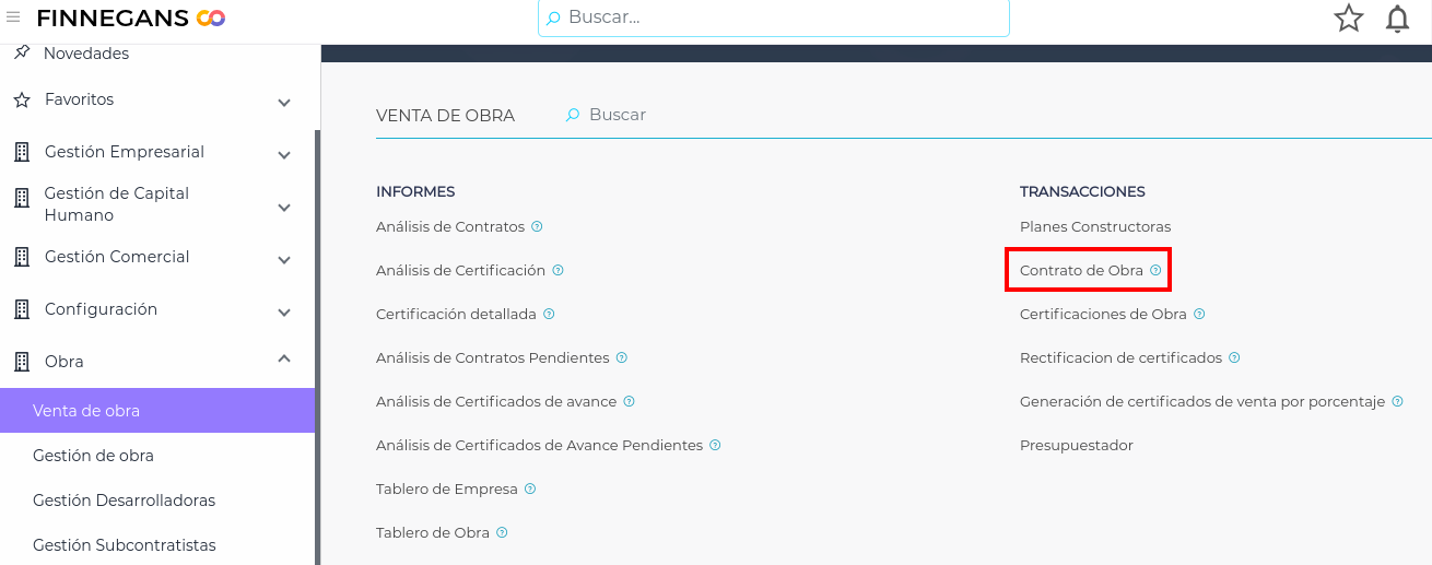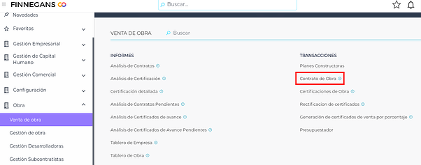 Se ve el Contrato ingresando en Menú → Obra → Venta de Obra → Transacciones → Contrato de Obra