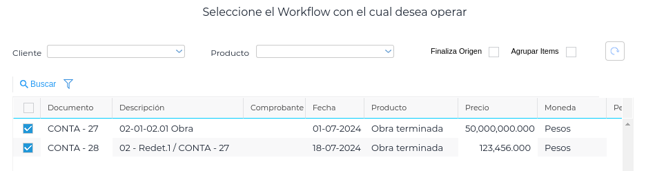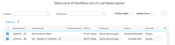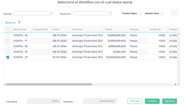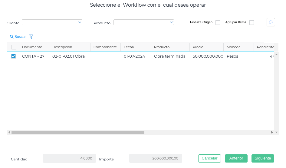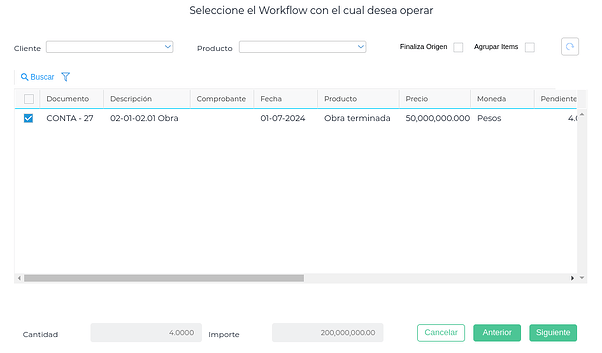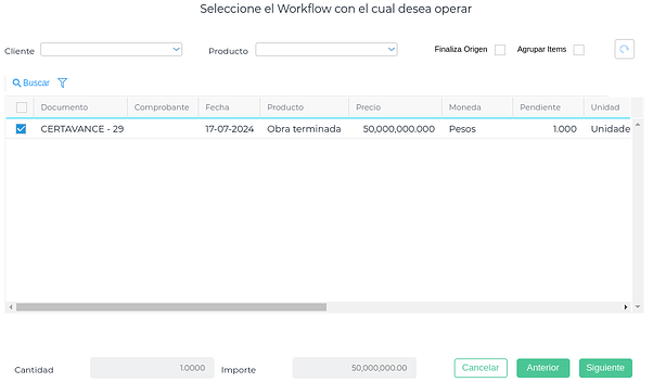 Se abre el asistente, y se selecciona el workflow de “Contrato de Ventas” y se elige el Certificado a facturar: