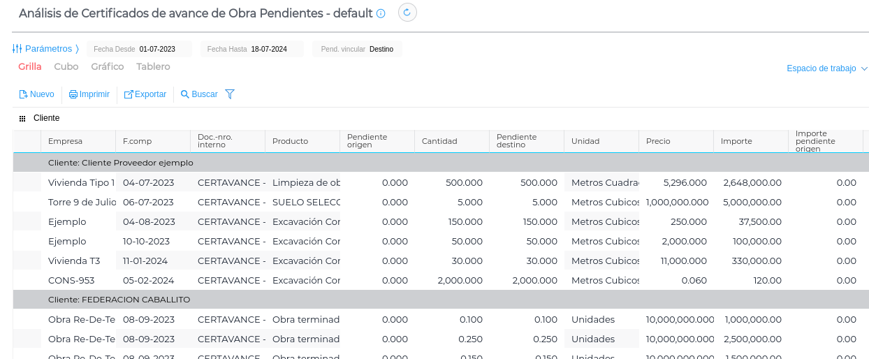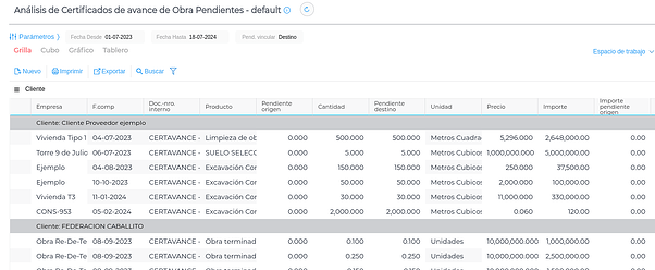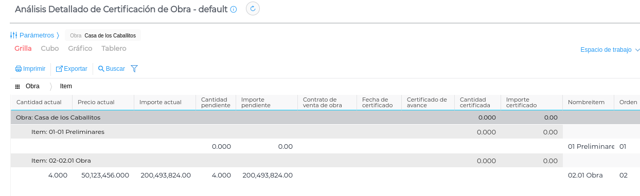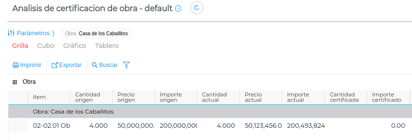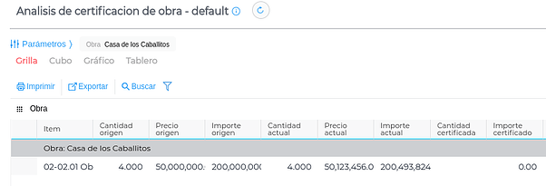 Se filtra por obra y se visualiza por cada ítem de la misma la cantidad total, la cantidad pendiente a certificar y el porcentaje de avance. También se visualiza el precio e importe de origen y el precio e importe actual si hubo redeterminación de precios.