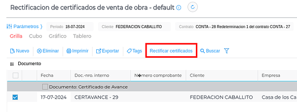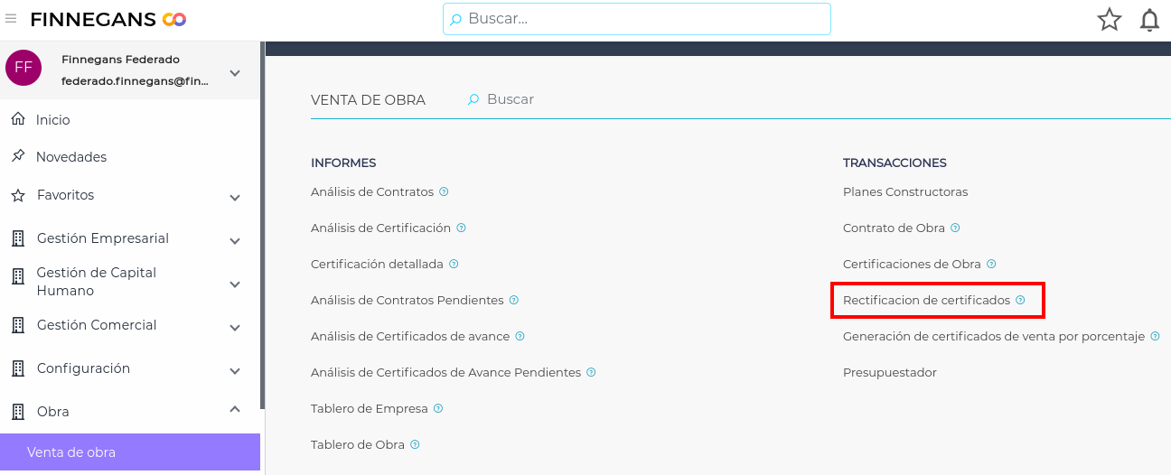 Para realizar la rectificación se accede a Menú → Obra → Venta de Obra → Transacciones → Rectificación de certificados