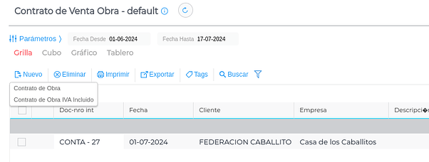 Se hace clic sobre el botón “Nuevo” (recordar la condición de IVA en la cual se venía trabajando con la Planificación de Obra y Contrato de Venta, y respetarla a lo largo de todas las transacciones del circuito)