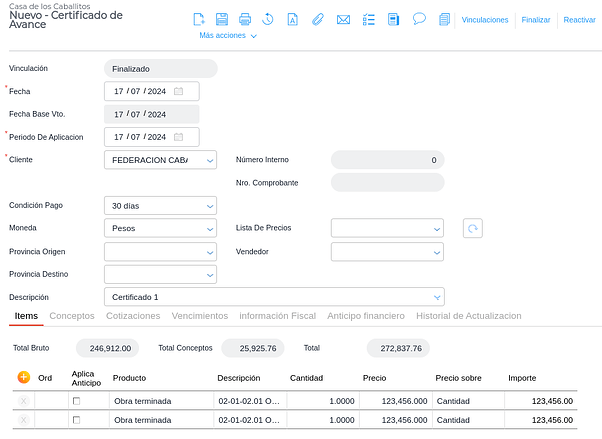 Periódicamente se registran los certificados de venta de obra. Para ello se utiliza un asistente que traerá sólo aquellos ítems que están pendientes de certificar.