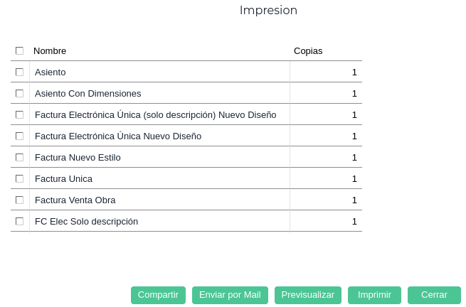 Importante: los diversos documentos en el sistema tienen la opción de ser impresos. Hay disponibles varios modelos de impresión, por ejemplo, en la Factura de Venta: