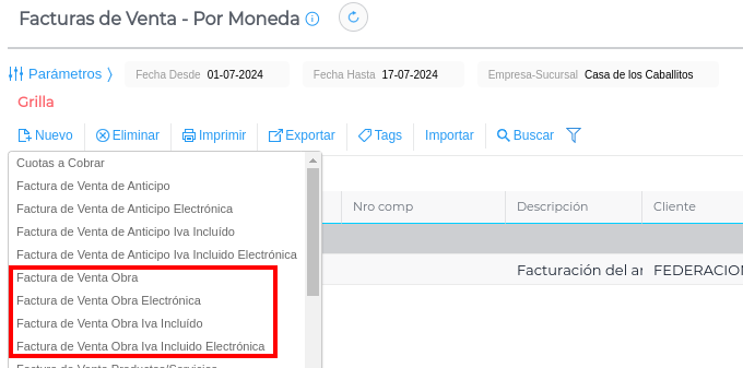 Se debe seleccionar las opciones de facturas de venta obra o facturas de venta obra IVA Incluido (respetando la condición de IVA del Plan y contrato).