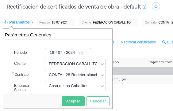 En los parámetros, se debe seleccionar el período a rectificar y contra qué contrato se hará la rectificación, de esta manera aparecerán los certificados del período solicitado: