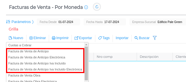 Y clickeando en el botón “Nuevo”, se selecciona “Factura de venta de anticipo” o “Factura de venta de anticipo IVA incluido” (respetando la selección de IVA en el Plan de Obra y Contrato).
