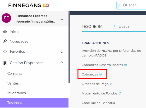 Para registrar la cobranza, ingresar desde Menú → Gestión empresarial → Tesorería → Transacciones → Cobranzas
