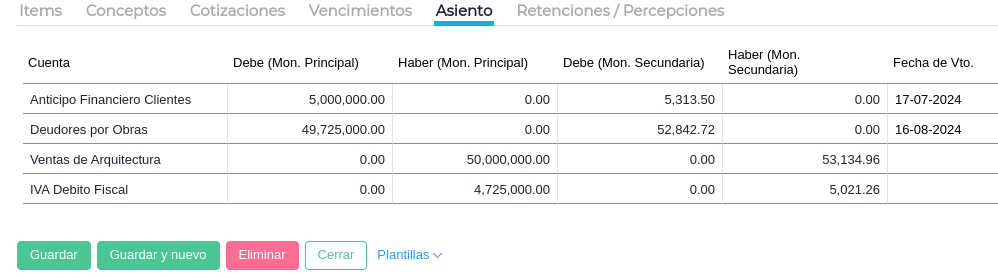 Se ve en la Factura creada, el asiento que se genera. El anticipo queda registrado en la cuenta “Anticipo financiero clientes”.