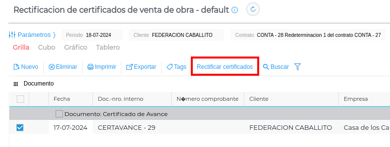 En la grilla, se selecciona el Certificado y se oprime el botón “Rectificar Certificados”.