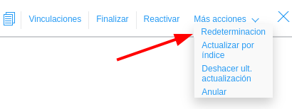 Se abre el contrato a redeterminar y se oprime el botón Más acciones → Redeterminación (ubicado en la barra de tareas)