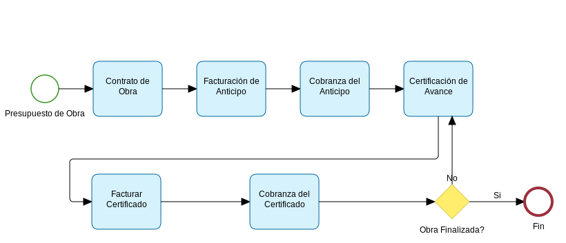 El circuito abarca desde el Contrato de venta de obra, documento donde se definen los ítems que constituyen la obra, hasta la gestión de la cobranza. El sistema contempla también la certificación y avance productivo de la obra, así como su facturación para su posterior cobranza.