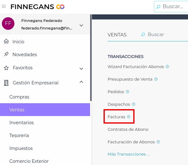 Al igual que las Facturas de Anticipo, se accede desde Menú → Gestión empresarial → Ventas → Transacciones → Facturas