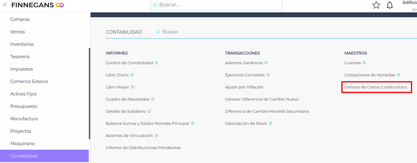 Se accede a ellos desde Menú → Gestión empresarial → Contabilidad → Maestros → Centros de costos constructoras