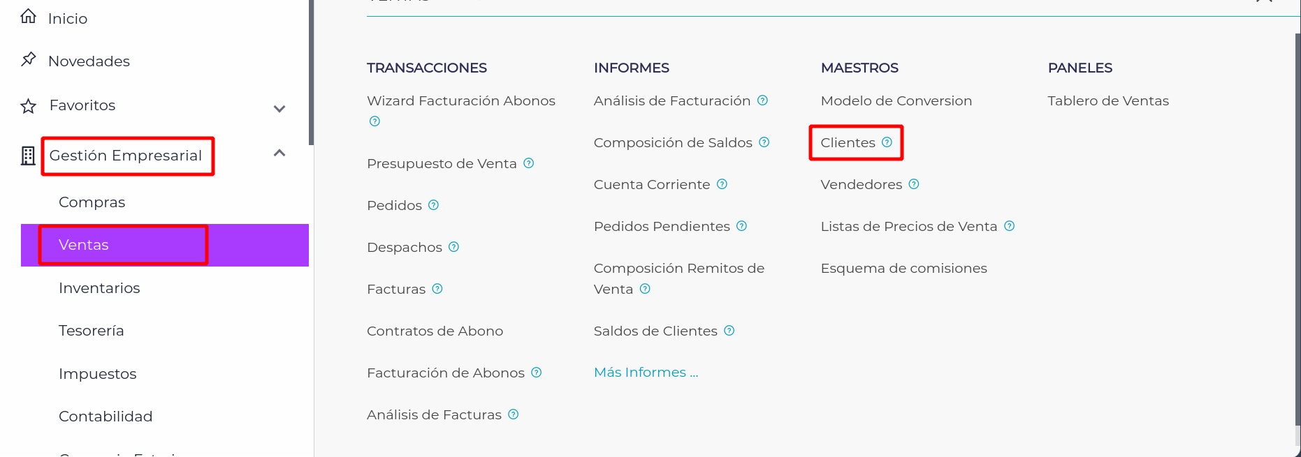 Menú > Gestión empresarial > Ventas > Maestro > Clientes