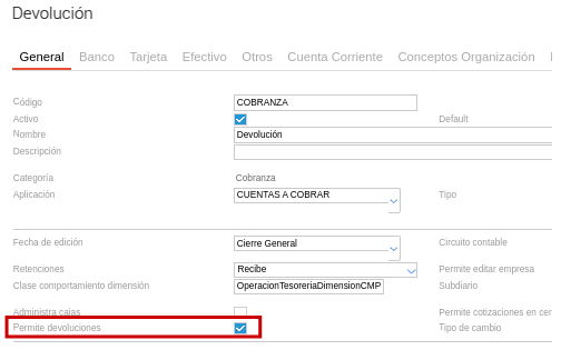 Para poder utilizar la nueva funcionalidad se debe configurar el tipo de documento con el tilde Permite devoluciones: