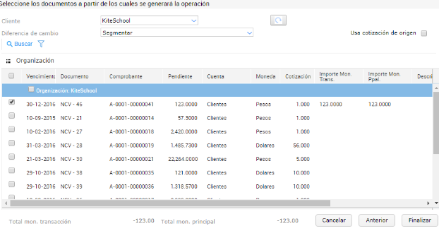 Se elige por asistente la nota de crédito (u otra transacción) por la cual se generará la operación.