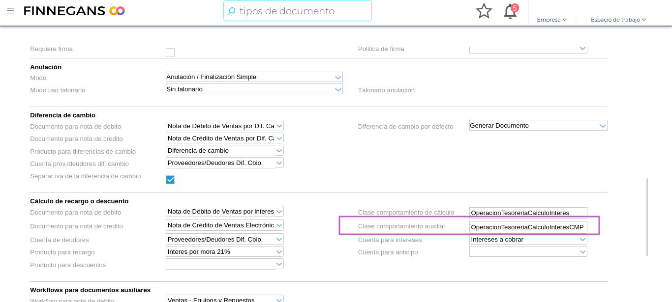 - Completar el campo “Clase comportamiento auxiliar” con OperacionTesoreriaCalculoInteresCMP