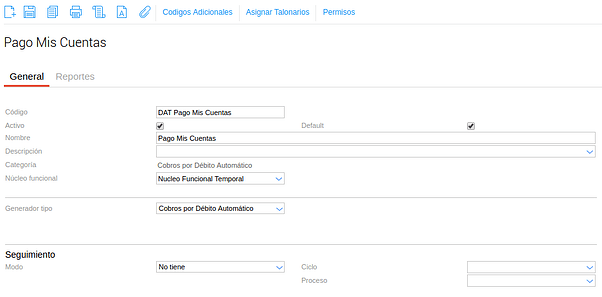 Automático configurado para pagos mis cuentas no debe tener tildado el checkbox Aplica filtro de operación bancaria, pero SÍ debe tener indicada una operación bancaria. Esto hace que al momento de filtrar facturas en la transacción de Cobro por Débito Automático se incorporen todas las facturas independientemente de la entidad de tarjeta de crédito o banco.