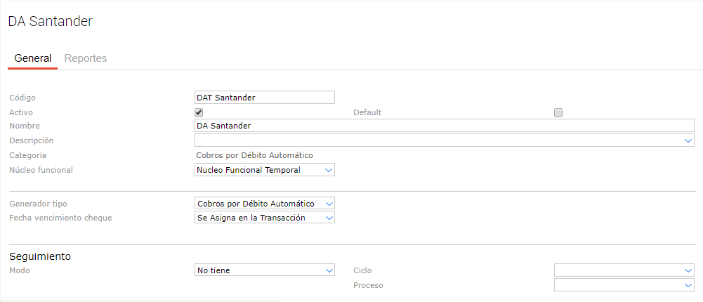 Operación Bancaria: No editable. Toma la operación bancaria indicada en el tipo de documento. Se utiliza para filtrar las facturas de venta que se incorporan al proceso.