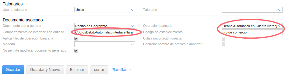 - El campo “nro de comercio” debe configurarse en el campo codigo de establecimiento del tipo de documento CDA correspondiente a “Tarjeta Naranja”