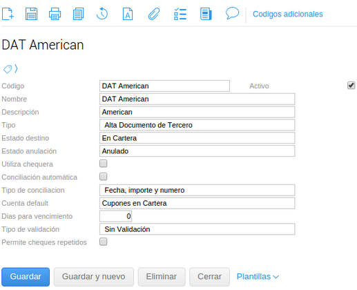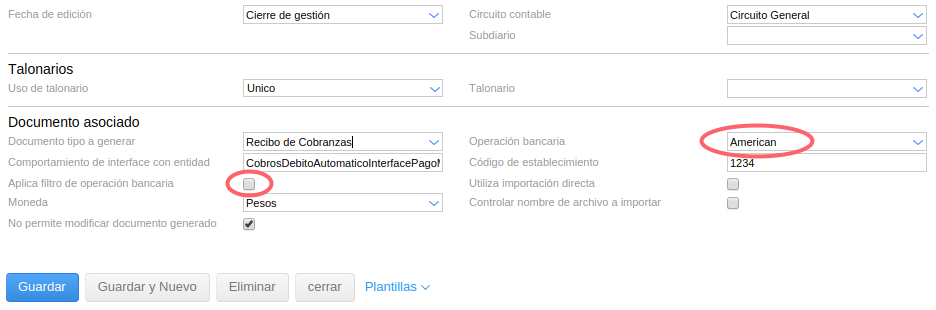 En cada documento se tienen que definir los atributos como se muestra en la imagen siguiente. Cabe destacar que en el tipo de documento se define la operación bancaria correspondiente a la entidad, el comportamiento para la interfase de archivos de exportación e importación y el documento de cobranza que se utilizará para generar el cobro. También se define el código de establecimiento que identifica a la empresa frente a la entidad de tarjeta de crédito o banco