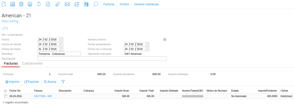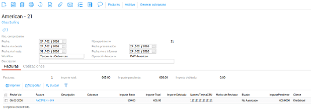 Autorizado: las facturas que son aceptadas por la entidad de tarjeta de crédito o banco, quedan en estado “Autorizado” en la grilla.