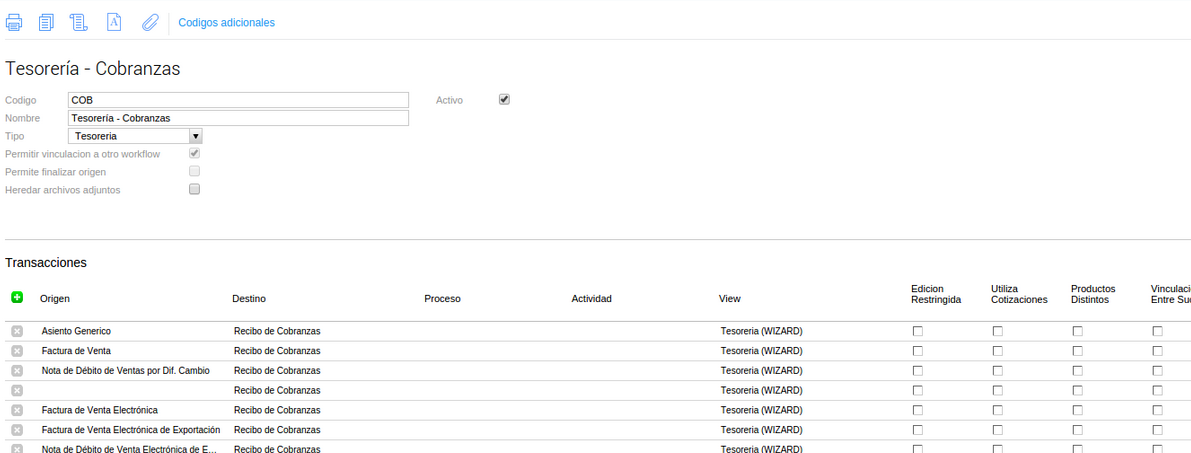 Se debe definir un workflow donde se especifiquen los tipos de documentos de operación de venta que serán tenidos en cuenta para el proceso de Cobros por Débito Automático.