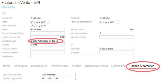 Al seleccionar como condición de pago “Débito Automático en Tarjeta”, se habilita la solapa “Débito Automático”. En ésta debés ingresar el número de tarjeta y la operación bancaria.